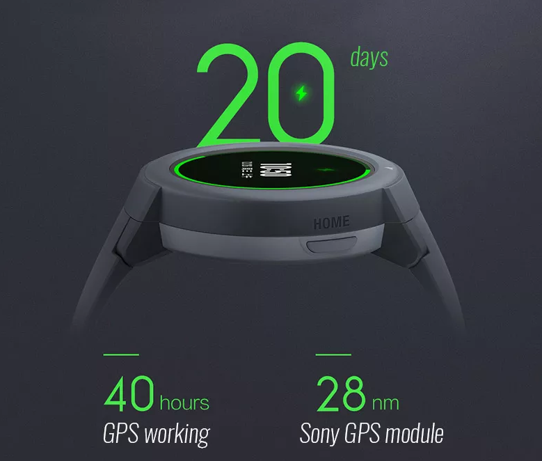 A Bateria dá um baile ao Verge. O Lite tem uma bateria de 390mAh que pode durar até 20 dias em standby e 7 dias em uso intensivo, 40 horas de GPS.